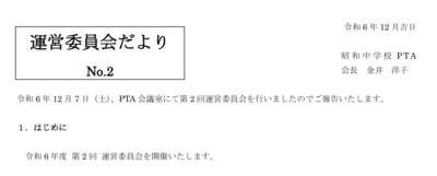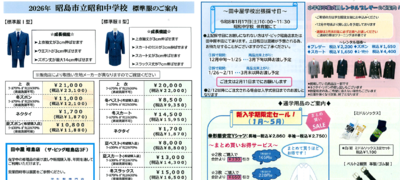 2025年度昭和中ニュース 全ての記事 全ての記事 アーカイブ 2026年3月 (1) 2026年2月 (0) 2026年1月 (0) 2025年12月 (3) 2025年11月 (1) 2025年10月 (0) 2025年9月 (0) 2025年8月 (0) 2025年7月 (0) 2025年6月 (0) 2025年5月 (3) 2025年4月 (0) 2025年3月 (2) 10件 1件 5件 10件 20件 50件 100件 「入学式のご案内」を掲載しました。 投稿日時 : 03/10 昭和中学校(管理職) クリックすると別画面にPDFファイルが開きます。 「令和8年度入学 昭島市立昭和中学校 新入生保護者説明会 資料」を掲載しました 投稿日時 : 2025/12/25 システム管理者 クリックをすると別画面にPDFファイルが開きます。 「令和8年度入学 標準服・体操着・上履きのご案内」を掲載しました 投稿日時 : 2025/12/24 システム管理者 クリックをすると別画面にPDFファイルが開きます。 「令和8年度入学 学費等口座振替手続きのご案内」を掲載しました 投稿日時 : 2025/12/24 システム管理者 クリックをすると別画面にPDFファイルが開きます。 「運営委員会だより No.2」を掲載しました 投稿日時 : 2025/11/15 システム管理者 クリックをすると別画面にPDFファイルが開きます。 「運営委員会だより No.1」を掲載しました 投稿日時 : 2025/05/29 システム管理者 クリックをすると別画面にPDFファイルが開きます。 「令和7年度 総会議案書」を掲載しました 投稿日時 : 2025/05/01 システム管理者 ここをクリックをすると別画面にZIPファイルがダウンロードできます。 「学校経営重点計画(教育推進計画)総括表」を掲載しました 投稿日時 : 2025/05/01 システム管理者 クリックをすると別画面にPDFファイルが開きます。 「昭和中学校会則改正案における新旧対照表」を掲載しました 投稿日時 : 2025/03/26 システム管理者 クリックをすると別画面にPDFファイルが開きます。 「令和7年度 昭和中学校PTA 予算書(案)」を掲載しました 投稿日時 : 2025/03/26 システム管理者 クリックをすると別画面にPDFファイルが開きます。